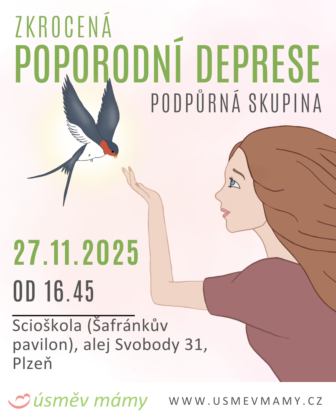 Scioškola Plzeň (Šafránkův pavilon) alej Svobody 31, PlzeňOtevřené setkání pro všechny ženy, které si po porodu prošly, nebo procházejí různými psychickými obtížemi. Setkání probíhá v bezpečném prostředí, s podporou ostatních. Je zde prostor sdílet, vnímat příběhy jiných žen, inspirovat se, čerpat povzbuzení a podporu. Popovídejte si v bezpečném prostředí o tom, co vás trápí. Podpora – pochopení – sdílení zkušeností Setkání vedou […]